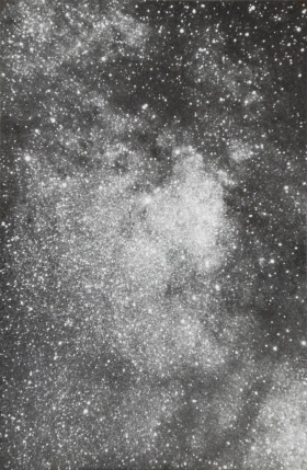Abb. 1: Milchstraße im Sternbild Scutum, Objektiv 1:1,8/135 mm, Sommer 1977, Penser Joch (Südtirol), Orangefilter Schott OG 590, Kodak 103a-E, Belichtung 45 Minuten,