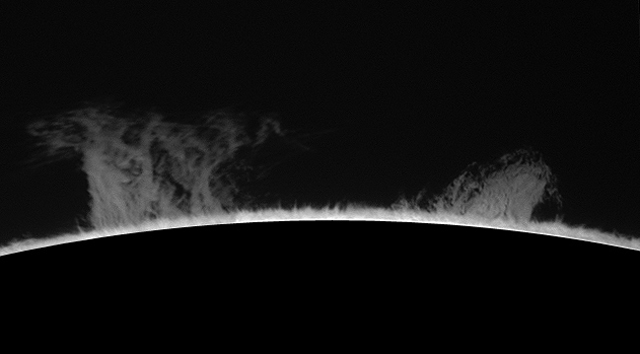 Abb. 10: Protuberanz, aufgenommen von Jens Leich am 22.08.2015 um 08:52 Uhr UT in Wiehl. Teleskop war ein Apochromat (Astrophysics Starfire) 130 mm/838 mm, 4-fache Telezentrik, hinter dem Filter und vor der Kamera reduziert auf ca. 2250 mm; Kamera: TIS-DMK-21AU618.AS, Filter: Solarspectrum, HWB = 0,05 nm, 45 vn 2200 Bildern verwendet, Belichtung: 0,8 ms, Gamma = 110, Verstärkung = 630, Software: FireCapture (Aufnahme), AviStack 2 (Stacking), Photoshop 6 (Endbearbeitung).