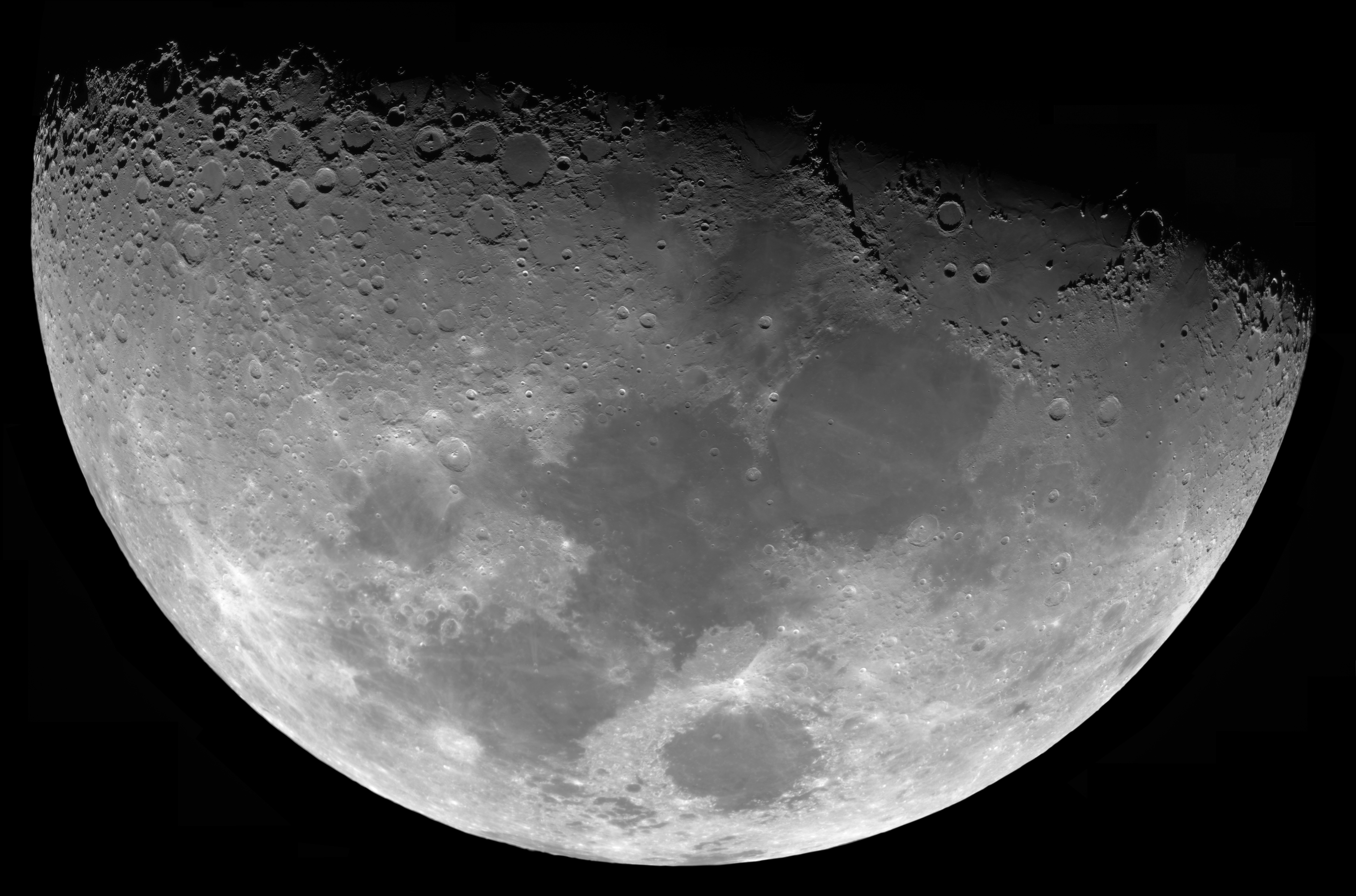 Abb. 11: Mondmosaik von Wolfgang Bischof - unbedingt hineinzoomen! Datum: 17.01.2016, Kamera: ASI174 (Marke ZWO) am 8-Zoll-Newton, ca. 4,5 m Brennweite. Das Seeing war brauchbar, wenn auch nicht überragend. Ziel war die Aufnahme möglichst großer Flächen mit hoher Auflösung. Mosaik aus 38 Einzelaufnahmen.