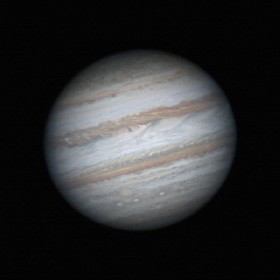 Abb. 12: Jupiter am 11.2.2015 um 22:29 Uhr UT, Celestron 11 bei ca. 5500 mm Brennweite, Kameras: ASI 120 MM und MC (monochrom und Farbe), belichtet wurden 20 Filme à 90 s und derotiert, 10 Fime mit Rotfilter und 10 mit Grünfilter für die Luminanz. Die Farbe wurde mit der ASI120MC am Anfang und am Ende der Belichtungsreihe gewonnen, geschärft wurde mit Hilfe der PSF eines Sterns. Norden ist oben, wie bei den meisten Darstellungen (bei 23 Uhr).