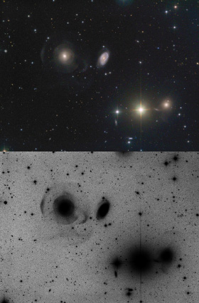 Abb. 18: NGC 474, 470 und 467 (von links), 30.09. und 01.10.2011, 14-Zoll-Hypergraph bei f = 1090 mm, Starlight SXV H9, Sternwarte Gahberg, LRGB mit Gesamtbelichtungszeit 4 h 40 min, Luminanz ohne Binning, RGB 2x2-Binning, Bild: Harald Strauß. Oben: normales Farbbild, unten: invertierte Darstellung mit gesteigertem Kontrast.