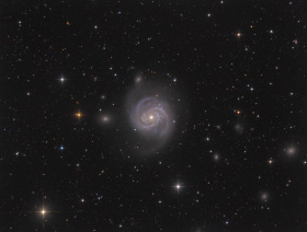 Abb. 19: Spiralgalaxie M 100 mit verschiedenen Begleitgalaxien, März und April 2014, 10-Zoll-Newton f/4, SBIG ST-2000XM, Luminanz 47 x 10 min ohne Binning, 130-mm-Newton f/5 mit einer Starlight SXV-H9, RGB 18 x 10 min ohne Binning, Sternwarte Gahberg,