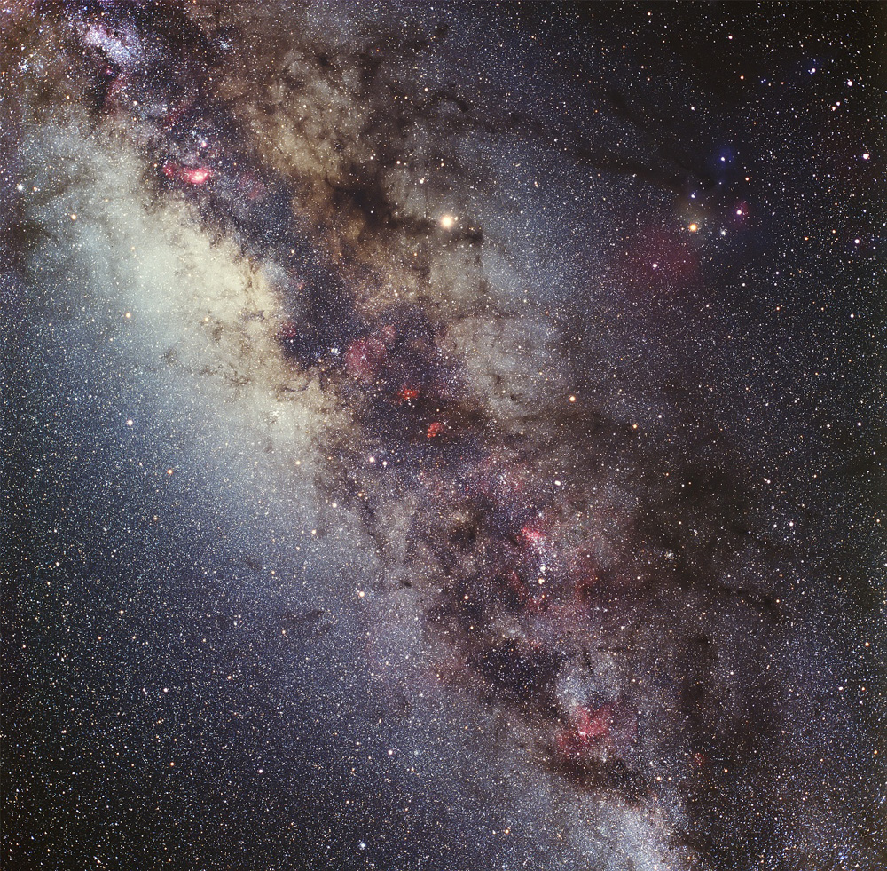 Abb. 2: Milchstraße im Schlangenträger, Schütze, Skorpion, Ara und Norma, entstanden 2001 auf Farm Tivoli (Namibia), 6x6-Mittelformatkamera Rolleiflex SLX mit Objektiv 1:2,8/80 mm, Farbdiafilm Kodak Ektachrome 200. Bei Blende 4 wurde 90 min belichtet.