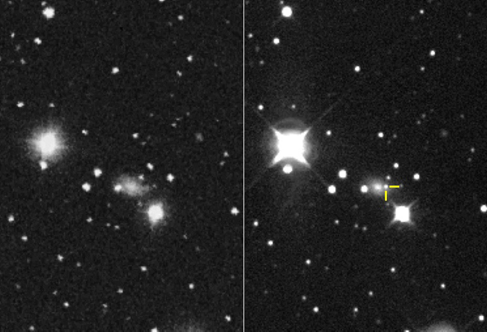 Abb. 4: Supernova 1995an in UGC 3188. Links: POSS Blue. Rechts: 20.11.1995, Helligkeit 16,7 mag, Newton 450 mm / 2000 mm, OES LcCCD 11N, 4 x 5 min belichtet.