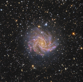 Abb. 5: Spiralgalaxie NGC 6946 im Cepheus, Maksutov-Cassegrain 180 mm / 1800 mm, CCD-Kamera QSI 540wsg monochrome, L: 18 x 600 s (ohne Binning), R: 13 x 300 s, G: 11 x 300 s, B: 12 x 300 s (Farben 2x2-Binning), RGB-Filter von Astrodon,