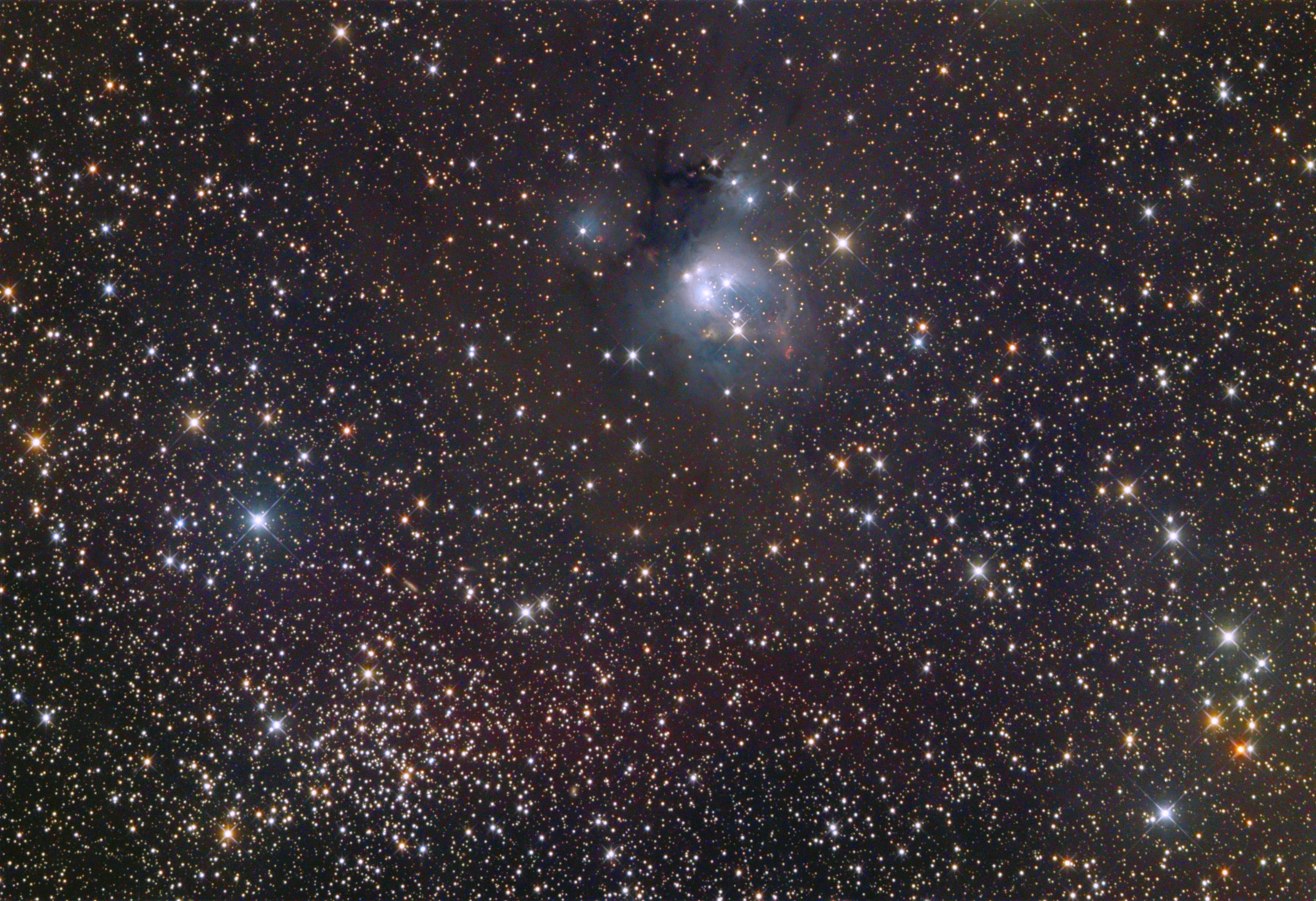 Abb. 6: NGC 7129 und NGC 7142 von Günter Kerschhuber, August 2010, Sternwarte Gahberg, ASA N10 mit f = 950 mm und SBIG ST-10XME für Luminanz (Belichtungszeit insgesamt 390 min), Televue NP101 mit f = 540 mm und Starlight SXV-H9 für RGB (393 min Gesamtbelichtungszeit). RGB-Filter von Astrodon, Farbkalibrierung B-V mittels Regim.