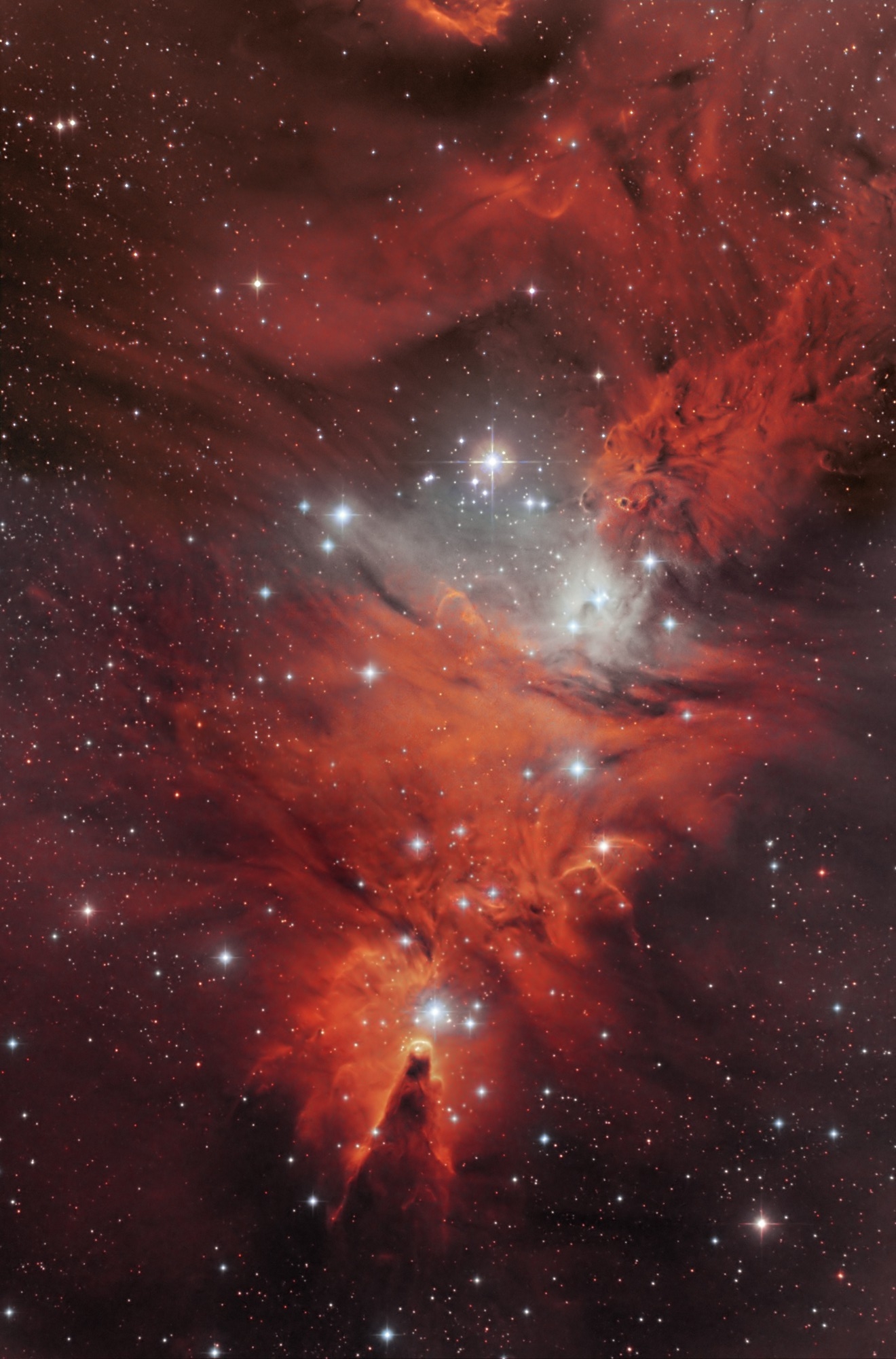 Abb. 7: Gerald Willems nahm im Februar 2015 das Gebiet zwischen NGC 2264 und dem Konusnebel auf, Newton 350 mm / 1200 mm, CCD-Kamera Atik 4000 M, Baader-Filter, belichtet wurde: 33 x 10 min in Hα, 13 x 10 min in [O III] und 10 x 10 min in [S II]. Das Bild ist eine Kombination aus Hubblepalette und CFHT-Palette (Canada-France-Hawaii Telescope-Palette). Bei letzterer werden die Farben fast nach ihrer natürlichen Lage im Spektrum zugeordnet. Hier allerdings: Hα = rot, [O III] = grün, [S II] = blau.