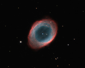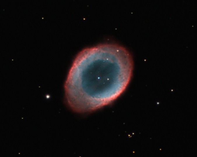 Abb. 8: PN M 57, Celestron 11 bei f/5 (1400 mm Brennweite), "Planetenkamera" ASI 120 MM (Farbe 120 MC). Belichtet wurden ca. 20.000 Bilder zu je 0,8 s.