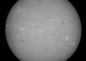 Abb. 9: Sonne am 20.03.2014 im Hα-Licht, Bild: Wolfgang Bischof. Teleskop war ein TS Photoline ED 110/770 mit Baader CERF-Energieschutzfilter, Baader 4-fach-Telezentrik und Solar-Observer 1.5 Hα-Filter mit 0,05 nm Bandbreite, effektive Brennweite mit 0,62-facher Telekompression 1900 mm. Das Bild ist ein Mosaik aus 94 Videostreams von je 400 Einzelbildern, aufgenommen mit einer DMK21AU.618 über insgesamt 20 Minuten. Stacking mit AutoStackert2, Schärfung mit Deconvolutionfiltern von Giotto, zum Schluss Kontrastanpassung mit Photoshop.